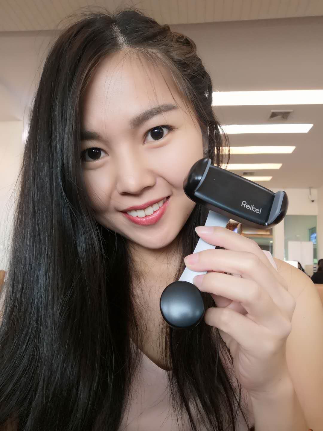 และที่ประทับใจที่สุดคือ แขนมันยาวใช่มั้ย เราก็ปรับมันตั้งขึ้น โทรศัพท์มือถือเราก็จะไม่บังแอร์เลยค่ะ