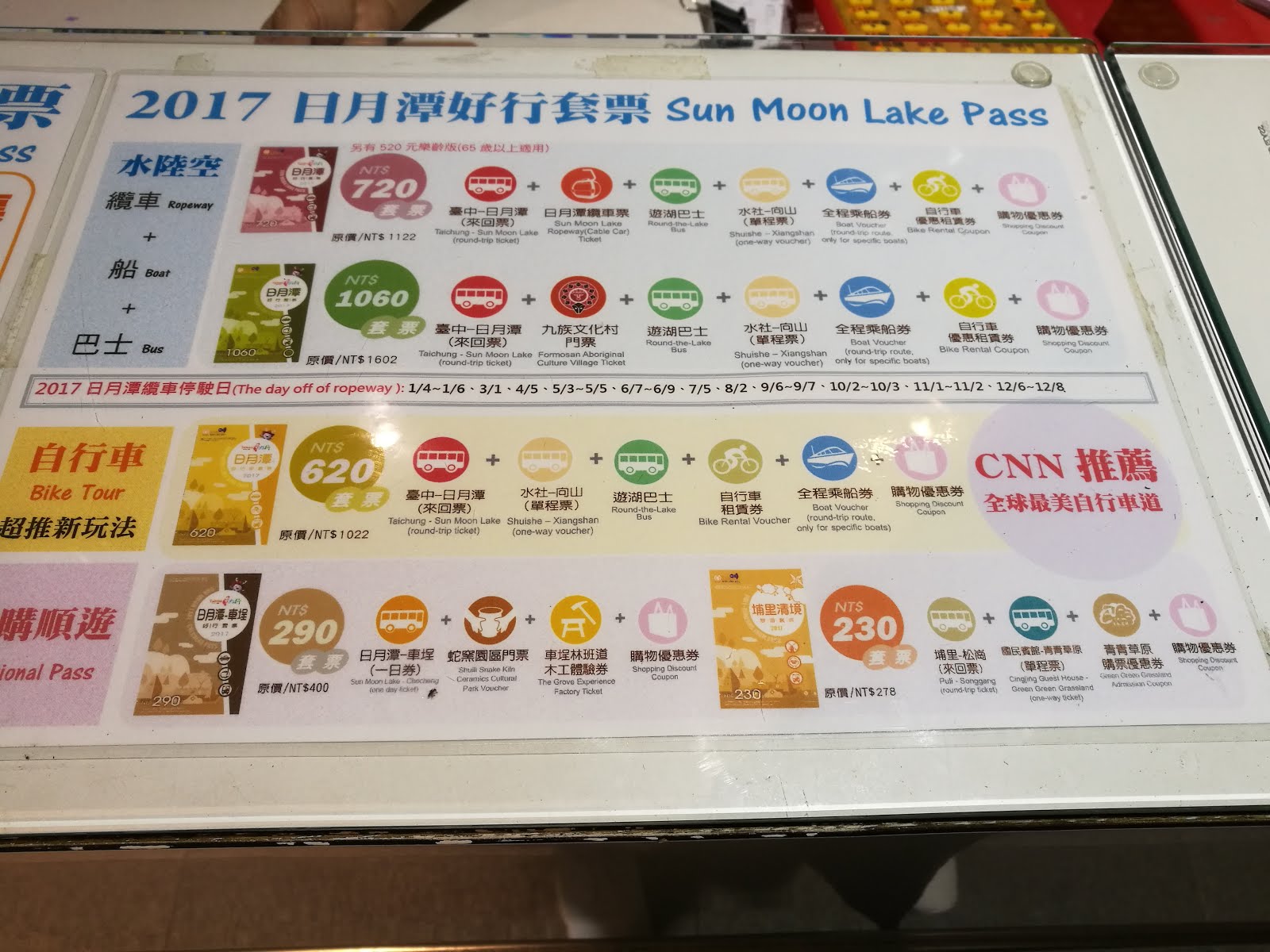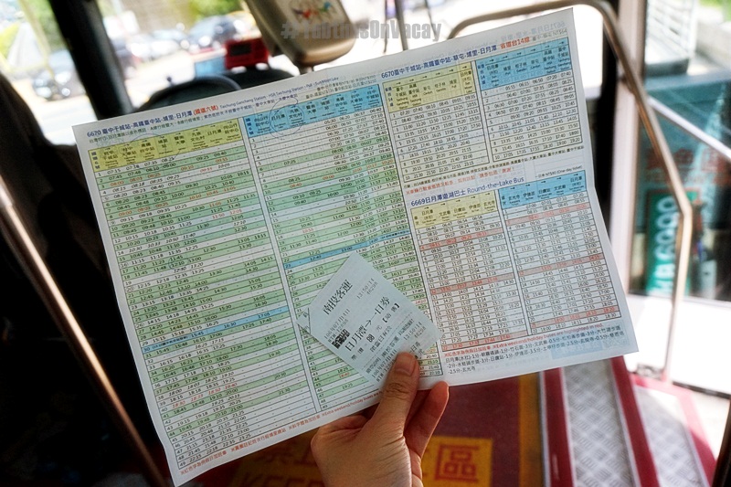 รร. เค้าให้เช็กอินบ่ายสองค่ะ เพราะฉะนั้นเราต้องลากตัวเองในสภาพที่ไม่ได้นอนเที่ยวต่อค่ะ เราเลือกที่จะไป Sun Moon Lake หรือทะเลสาปสุริยันจันทรา ใครหรอช่างตั้งชื่อภาษาไทย ไปค่ะ นั่ง TRA Taichung ไปลง HSR Taichung แล้วก็เดินลงไปข้างล่าง ทางออก 5 ตามป้าย ‘Bus Station’ เพื่อไปขึ้นรถบัสค่ะ ตรงนี้เราสามารถซื้อแพคเกจเที่ยว Sun Moon Lake ได้เลยนะคะ ถ้าใครคิดจะเก็บกิจกรรมให้ครบทั้ง รถบัสไปกลับไถจง-Sun Moon Lake, ล่องเรือในทะเลสาป Sun Moon Lake, ปั่นจักรยาน, นั่งกระเช้าลอยฟ้า, รถบัสทัวร์รอบทะเลสาป และอะไรอีกไม่รู้จำไม่ได้ ก็ซื้อเลยค่ะ คุ้มกว่า ประมาณ 800+ TWD ส่วนเราคิดว่าคงเก็บไม่หมด เวลาไม่พอ และเราไม่อินกับการล่องเรือและกระเช้าลอยฟ้า เลยเลือกแค่ รถบัสไปกลับ ประมาณ 400+TWD ไปถึงโน่นก็ซื้อตั๋วรถบัสทัวร์รอบทะเลสาป 80 TWD ค่ะ