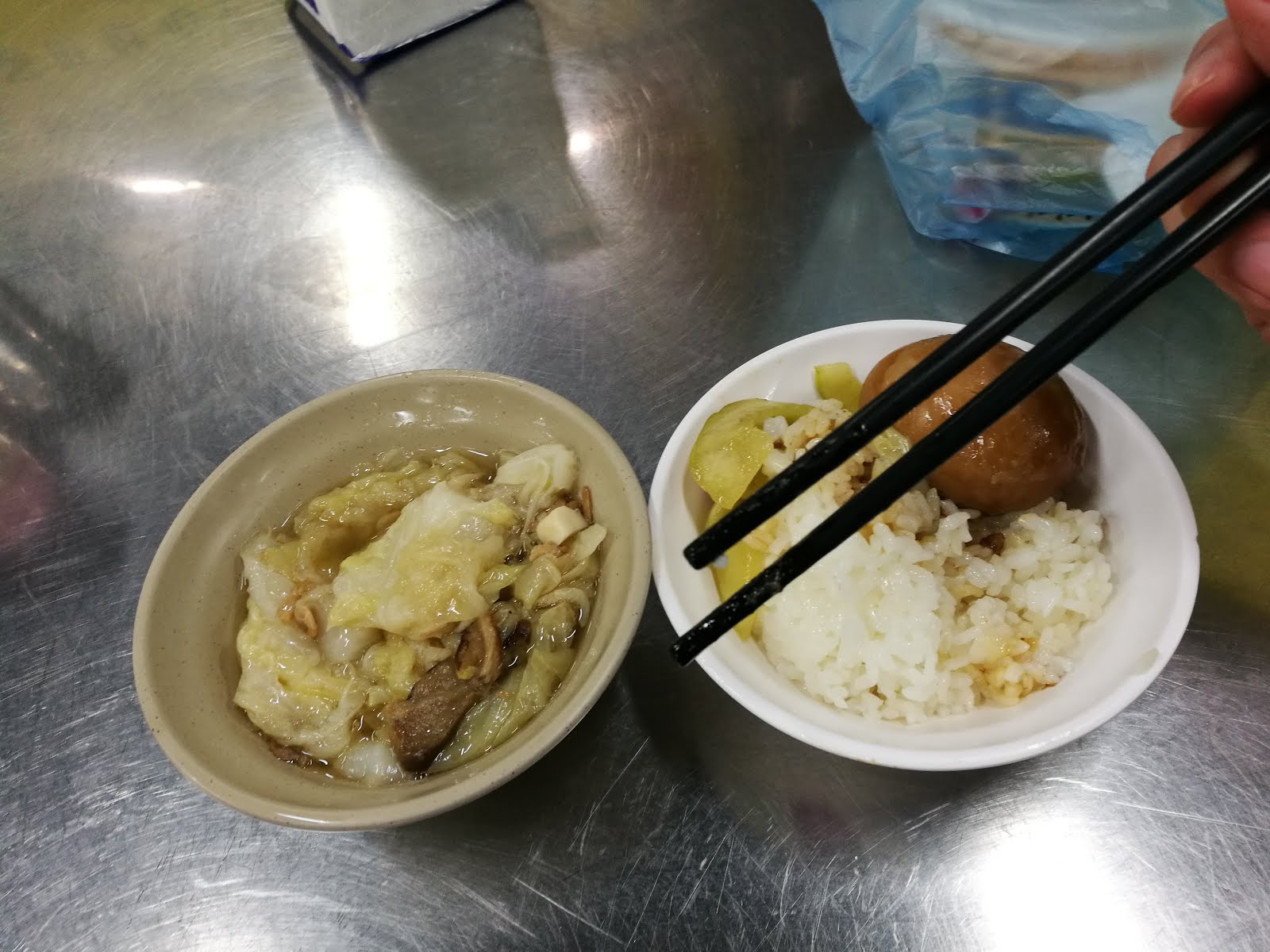 มีปัญหากับการใช้ตะเกียบค่ะ ยิ่งคีบข้าวนี่ยิ่งปัญหาใหญ่เลย นี่ก็พยายามคีบเข้าปากไป จะซดน้ำทำไงดีล่ะ มาแค่ตะเกียบ ไม่มีช้อนเลย หันไปมองโต๊ะข้างๆซ้ายขวา ทุกคนทำท่าเดียวกัน คือยกชามข้าวขึ้นมาแล้วใช้ตะเกียบคีบเข้าปาก น้ำซุปก็ยกซดเลย เอ่อะ โอเค ลองๆๆ ยกชามข้าวมาใกล้ๆปาก แล้วก็คีบ คือคนมันคีบไม่ได้เนอะ มันก็ไม่ต่างกันป่ะ สุดท้ายถึงได้รู้ว่า เค้าเขี่ยข้าวเข้าปากกันสินะ